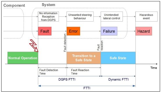 FTTI 和安全状态的确定。如图 2 所示,FTTI 是从一个故障被注入到危害发生之间的时间。对于高级自动驾驶系统,FTTI 决定了使车辆不会失去控制所需的容错等级(如冗余、功能降级)。