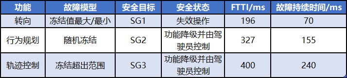 根据表 2 和仿真试验数据,可以分析得到危害分析和风险评估的部分结果,如表 3 所示,其中包括根据图 2 和图 3 计算得到的特定功能的最严重失效模式(表示为故障模型)的 FTTI 值。而故障持续时间即以一种适当的方式处理故障(过渡到安全状态)的时间。例如,与轨迹控制器相关的故障可以在危害事件发生之前在系统中存在 400ms:其中 240ms 以检测和反应,160ms 来控制故障,这样可做到不违反安全目标。表 3 中具体的安全目标定义如表 4 所示。