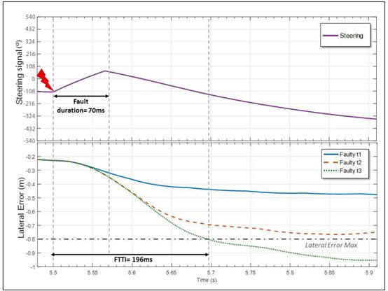 按照第二章的步骤,故障发生器基于先前建立的故障列表自动注入故障。为了使故障产生最严重影响,这些故障在几个曲线点触发,以得到最严重的影响。由于我们仿真的主要目的是计算横向控制的 FTTI 值,因此被观测信号为横向误差和转向饱和。图 3 描绘了转向控制的 FTTI 的的计算原理。