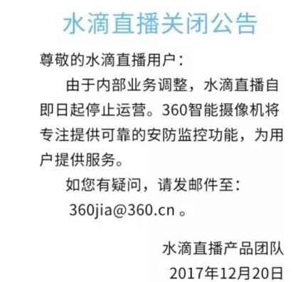 360公司于今日宣布主动、永久关闭水滴直播平台。水滴直播产品经理发布公开信,称未考虑到被直播用户的感受,“我们必须承认这个错误,也希望改正这个错误”。公开信中提到,不久前,一篇名为《一位92年女生致周鸿祎:别再盯着我们看了》的文章刷爆朋友圈,随即引发争议。文中写道,“在对顾客被直播这件事情上,可以说是我们心存侥幸,也可以说是我们欠缺思考”。我们决定今天起,360智能摄像机删除所有直播相关功能,只提供安防监控功能。水滴直播平台也全面关闭,不再提供任何直播服务。