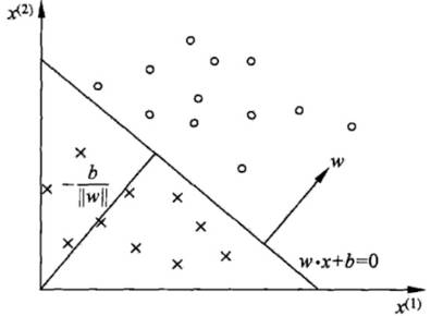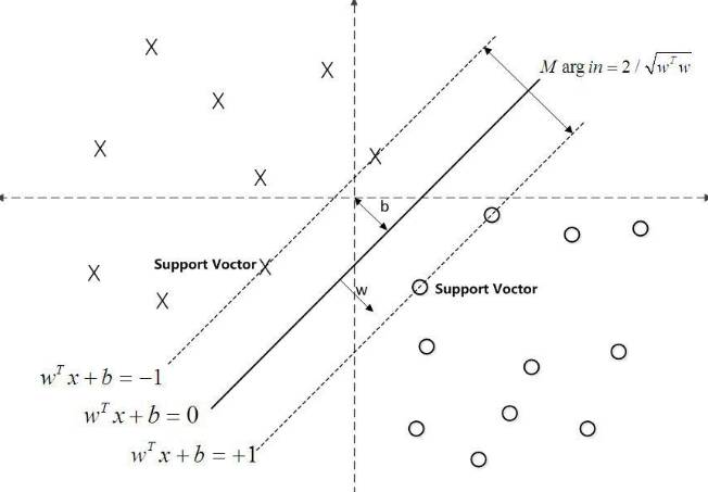 如下图所示,分离超平面为wTx+b=0,如果所有的样本不光可以被超平面分开,还和超平面保持一定的函数距离,那么这样的分类超平面是比感知机的分类超平面优的。可以证明,这样的超平面只有一个。和超平面平行的保持一定的函数距离的这两个超平面对应的向量,我们定义为支持向量,如下图虚线所示。