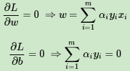 首先我们来求和w和b的极小值,即minL(w,b,α)。这个极值我们可以通过对和w和b分别求偏导数得到: