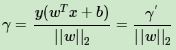 在分离超平面固定为wTx+b=0的时候,|wTx+b|表示点x到超平面的距离。通过观察wTx+b和y是否同号,我们判断分类是否正确,这些知识我们在感知机模型里都有讲到。这里我们引入函数间隔的概念,定义函数间隔γ′为: