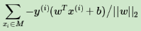 感知机模型的损失函数优化,它的思想是让所有误分类的点(定义为M)到超平面的距离和最小,即最小化下式: