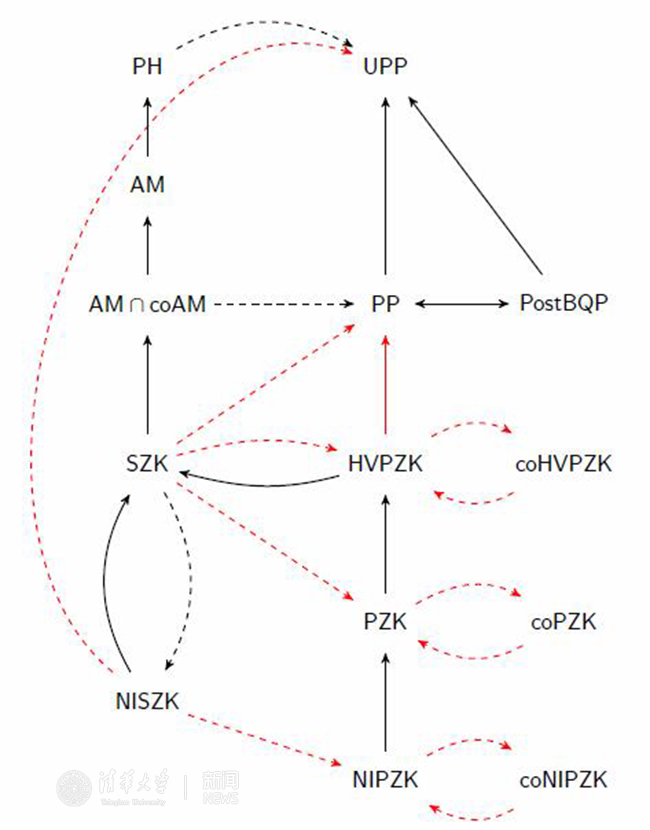 该研究工作也顺带提出一些新的喻示分割,并且给出了关于通信复杂度(Communication Complexity)类的结构的一些结果。陈立杰是论文的主要贡献者,结合了之前提出的一些工具,构造了统计零知识证明系统和PP之间的喻示分割,随后又与合作者一起加强了这个结论。