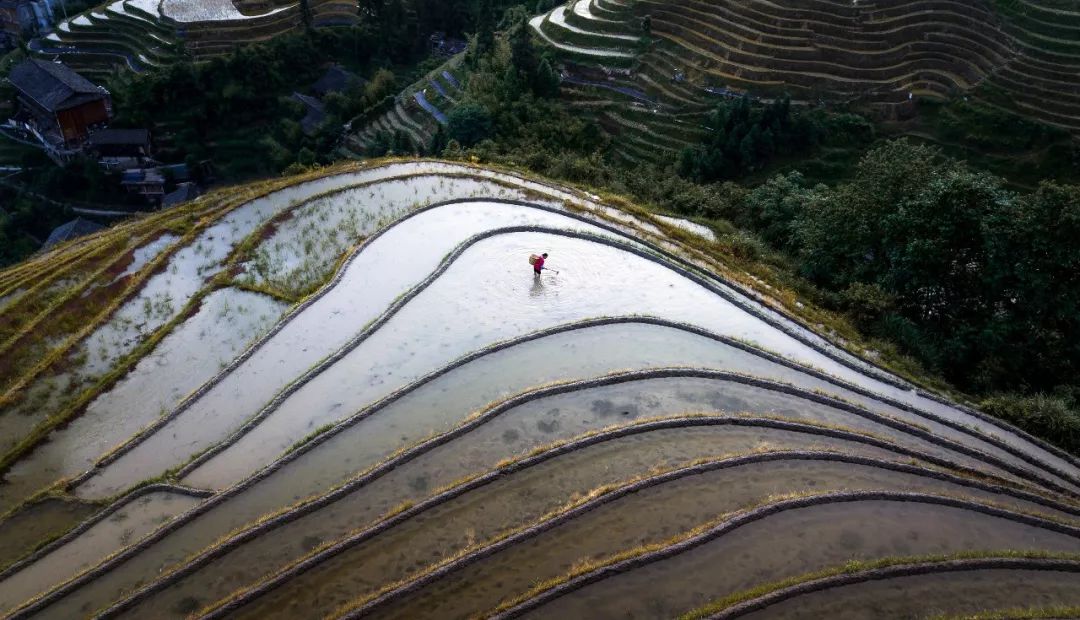在5月中下旬,梯田待耕种,灌溉水进入梯田中。待天上出现了云彩或者阳光,取景框中再搭配劳作的农夫,农田中的倒影,神似云中的耕作,令人遐想。除了图片的拍摄,还可以尝试用无人机拍摄云雾流动的延时摄影。不少当地的摄影人,为了守候这仙境般的云雾,甚至甘愿在平安寨中,守候数天。