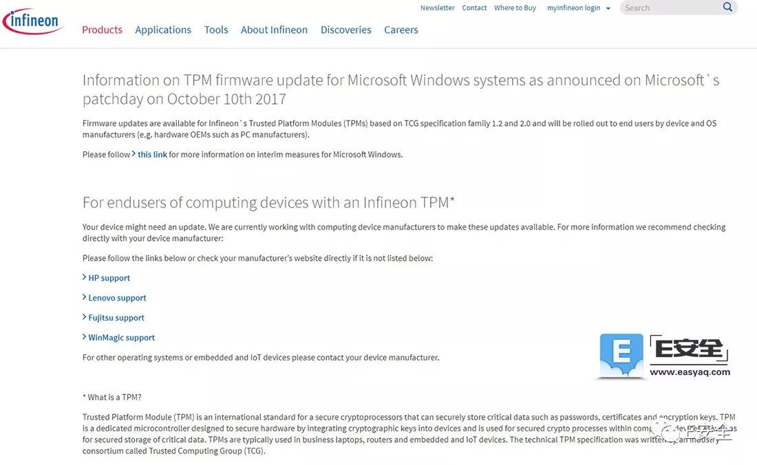 这三家供应商正在努力推出固件更新,并已经发布因使用英飞凌TPM而受到影响的详尽产品清单。