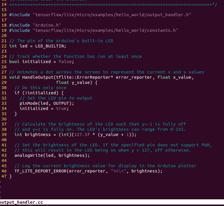 实现 Arduino 输出处理的代码在 hello_world/arduino/output_handler.cc,用于代替原始文件 hello_world/output_handler.cc。