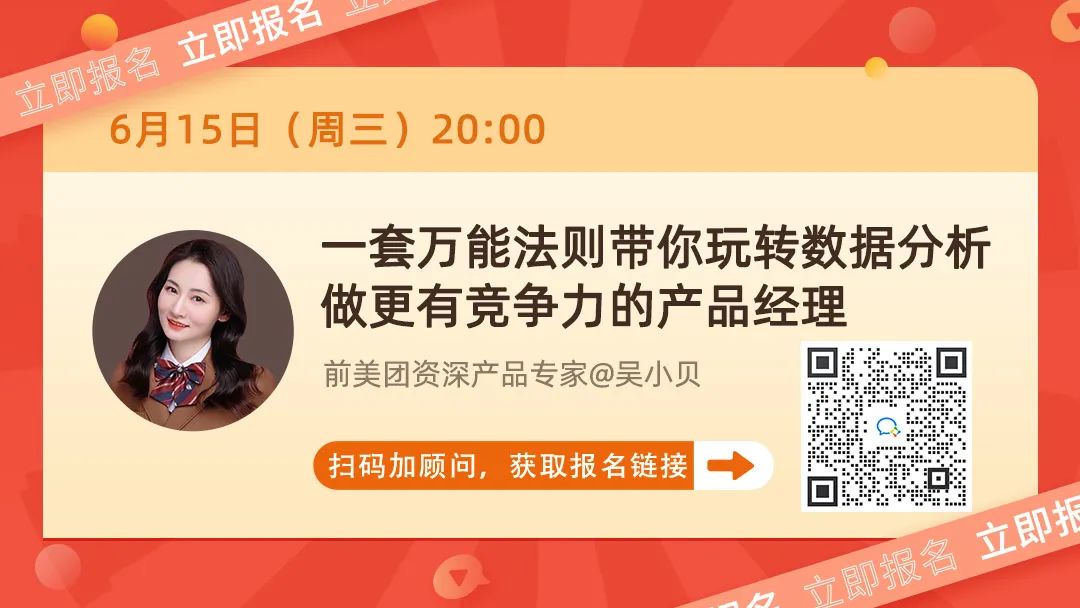 周三晚8点,前美团资深产品专家@吴小贝 教你练就一套万能数据分析法则,5个步骤带你拆解一套大厂产品经理的数据分析流程!