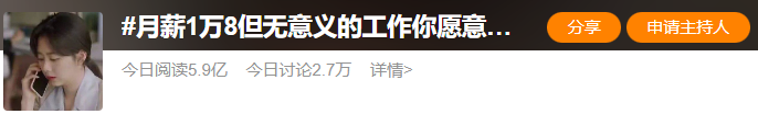 这个话题#月薪1.8W但毫无意义的工作你愿意做吗#也一度冲上微博热搜第一,当日阅读高达5.9亿。