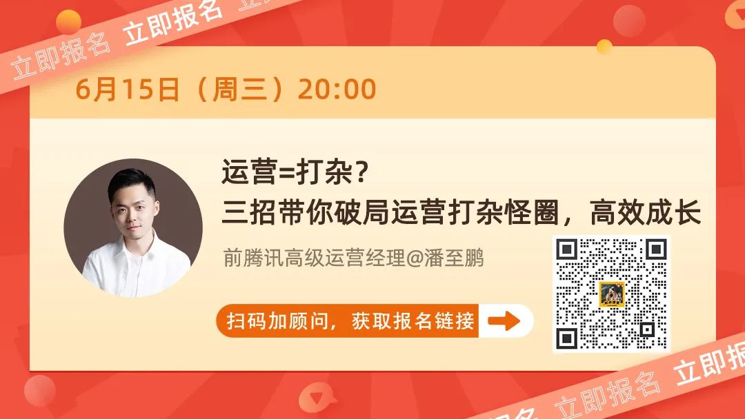 6月15日(周三)晚8点,前腾讯高级运营经理@潘至鹏,教你三招摆脱打杂困境,早日实现高薪!
