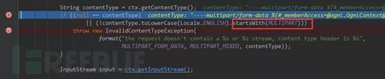 接着交给依赖包fileipload进行解析,首先会判断contentType是否为空,如果不为空再判断是否是MULTIPART开头如果不是就报InvalidContentTypeException的异常。这就证明了为啥流传的poc的multipart/form-data字段前面或多或少的老有一些没有任何联系的任意字符。