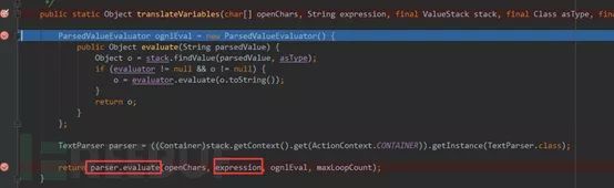 再次跟进最终由TextParseUtil类的evaluate方法对ongl语句进行了解析。