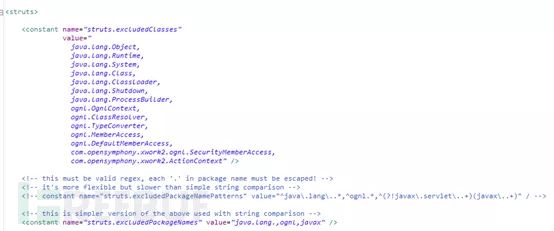 既然知道了漏洞触发点构造ongl语句是不是就可以直接远程命令执行了?当然还是不能,因为Struts2自己的安全管理器,对非法字符进行了黑名单校验。像我们要想执行命令的Runtime ,System,Classloder的危险类全部禁止掉了,那我们怎么去执行系统命令。