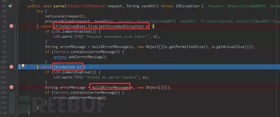 放发生异常后,又会返回到JakartaMultiPartRequest类的parse方法对异常进行处理。看一看有两异常,第一个文件过大异常,和除文件过大外的其它异常。当发生异常后他们都会进入一个神奇的方法buildErrorMessage。