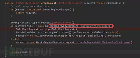 继续跟进,发现会对ContentType进行判断,看是否包含multipart/form-data字段,包含就继续,不包含就G,这就是说为什么网上流传的那些poc为什么都需要构造multipart/form-data字段。跟进getMultiPartRequest