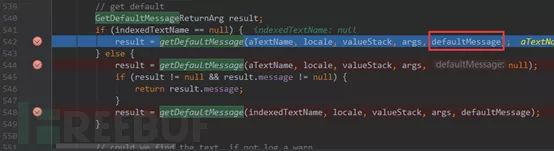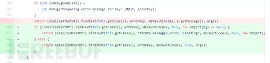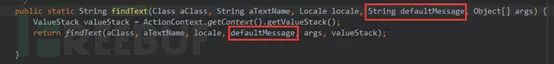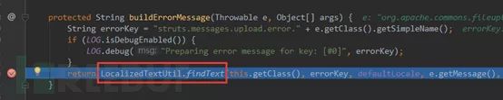 被处理的FindText方法中,有一个重要的参数也就是e.getMessage,里边存了异常信息和咱们恶意的构造的ContentType。最后会把ContentType中的ongl语句去解析执行。所以官方不再把e.getMessage作为而LocalizedTextUtil.findText的defatulMessage参数而是作为args参数传入。