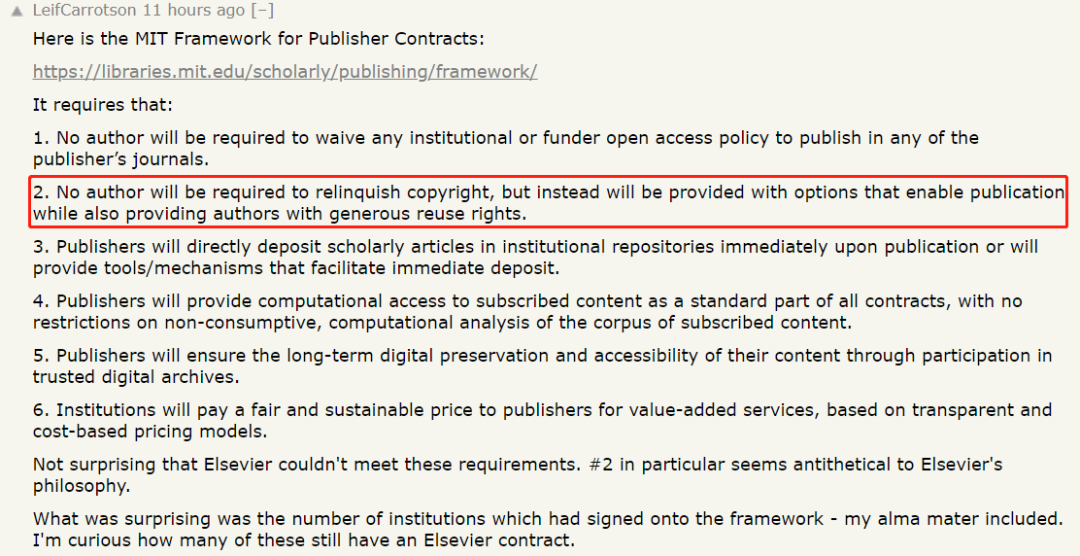 如今,著名学术机构 MIT 与爱思唯尔的谈判也宣告破裂。这是否意味着开放获取运动(OA)将走向新高潮?爱思唯尔等出版机构是否能够适当放松限制,为学术界知识的流通做出应有的贡献呢? 网友:分道扬镳意料之中,解决之路依旧漫长 MIT 与爱思唯尔的决裂在社交网络上引起了激烈谈论,有网友贴出了《MIT 有关出版商合约的指导性框架》的六项核心原则,认为爱思唯尔毫无疑问无法达到这些要求,特别是第 2 条中「出版商不应要求作者放弃文章版权,相反应为作者提供一些选项,以支持文章发表并保证文章的重复使用权」,而这与爱思唯尔的经营理念背道而驰。 这样看来,《MIT 有关出版商合约的指导性框架》与爱思唯尔的经营理念存在内在不一致性,分道扬镳也是意料之中的事情。