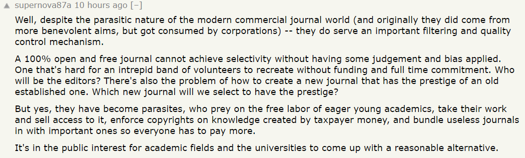 不过也有网友发出「灵魂一问」:实在不理解为什么 JSTOR、爱思唯尔以及其他类似学术出版机构能够长久存在下去。 ta 还提出建议,顶级大学应针对每个学科提供非盈利性出版服务,每个期刊分别设立一名付费服务商和付费编辑,然后聘请同行审稿人,最后将论文编辑成月刊发表。