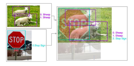 mixup 的意思就是将两张图按照一定的比例混合在一起,详情移步论文:Bag of Freebies for Training Object Detection Neural Networks[4]。这里要说的是如何 mixup,如何选择 mixup 的对象。