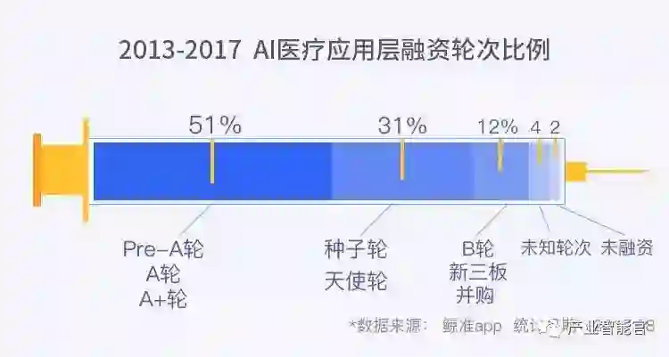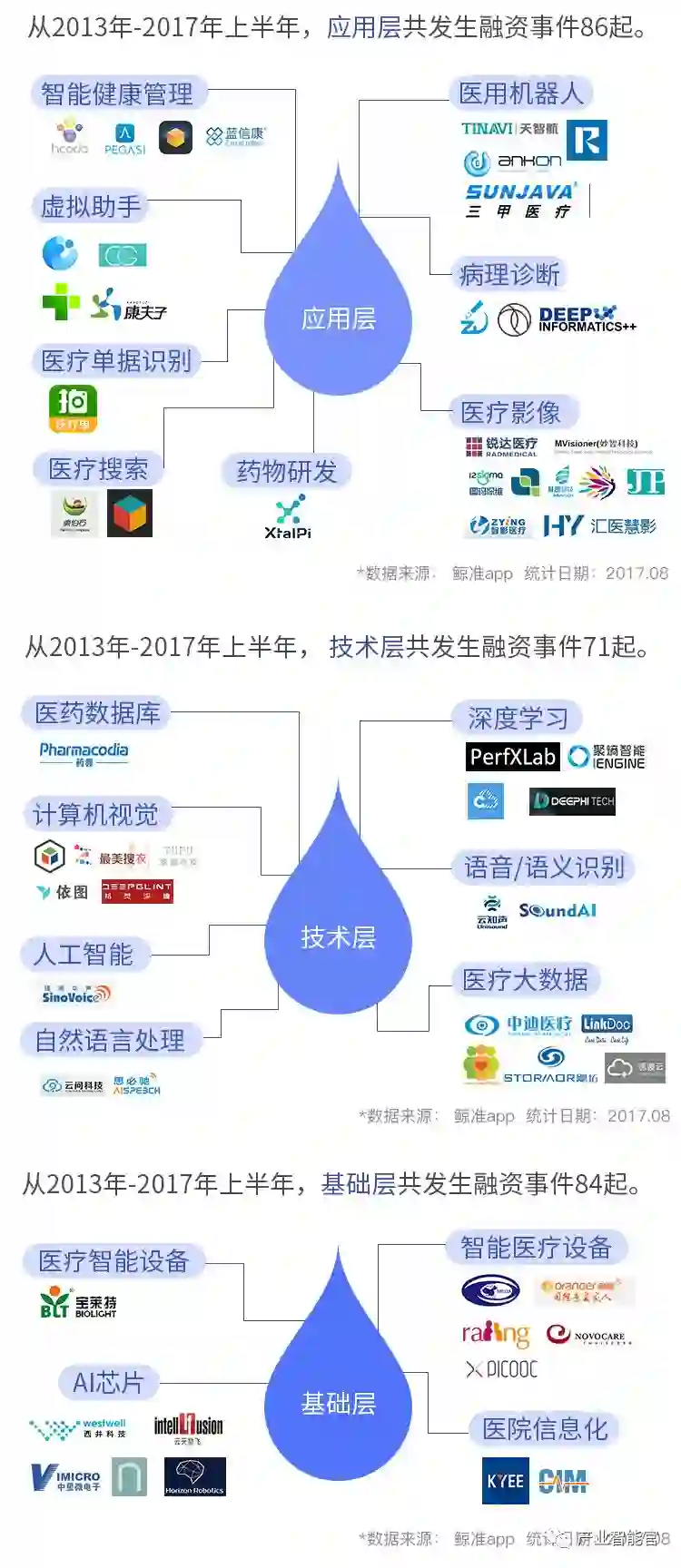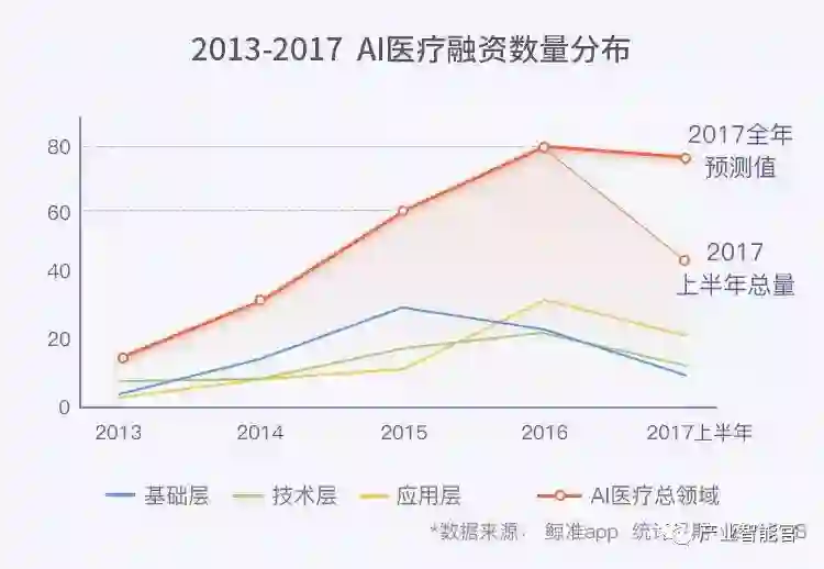回顾13年-17年数据,从2015年开始,基础层热度明显下滑,而资本开始纷纷进入应用层。2017上半年AI医疗发生融资数量46起,下面是应用层各维度融资情况。