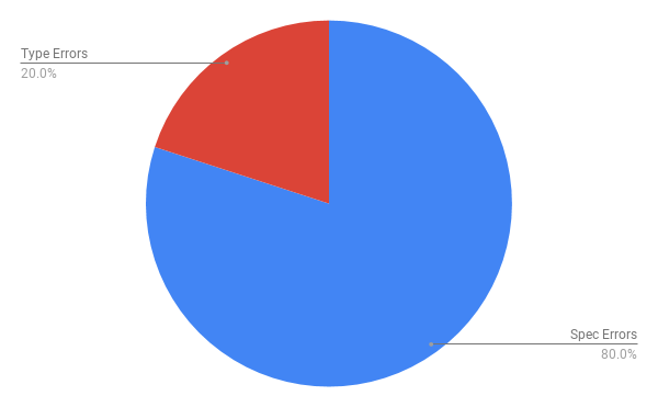 为什么 TypeScript 检测不到这么多 bug,为什么我把减少 20% 的 bug 密度说成是“理论上最大的”?首先,GitHub 上有 78% 的公开 bug 是由规范错误引起的。在很大程度上,未能正确实现规范是最常见的错误类型,而这导致了 TypeScript 无法检测或预防绝大多数 bug。在上述的研究报告中,研究人员对一系列“TypeScript 检测不到的错误”进行了分类。