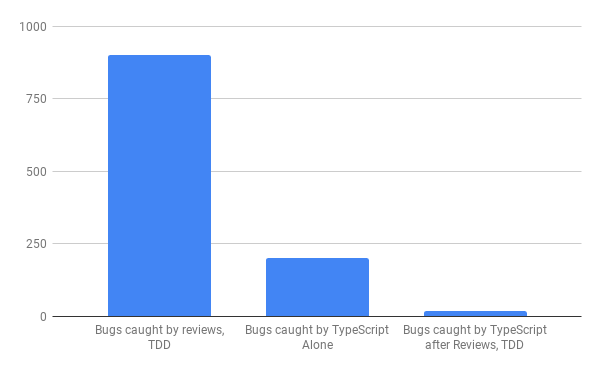 评审和 TDD 在没有 TypeScript 的情况下捕获 1000 个 bug 中的 900 个。如果忽略评审和 TDD, TypeScript 会捕获 1000 个 bug 中的 100 个。显然,你不一定是在它们之中做出选择,而是在采取其他措施之后再加入 TypeScript,而此时获得的改进非常有限。
