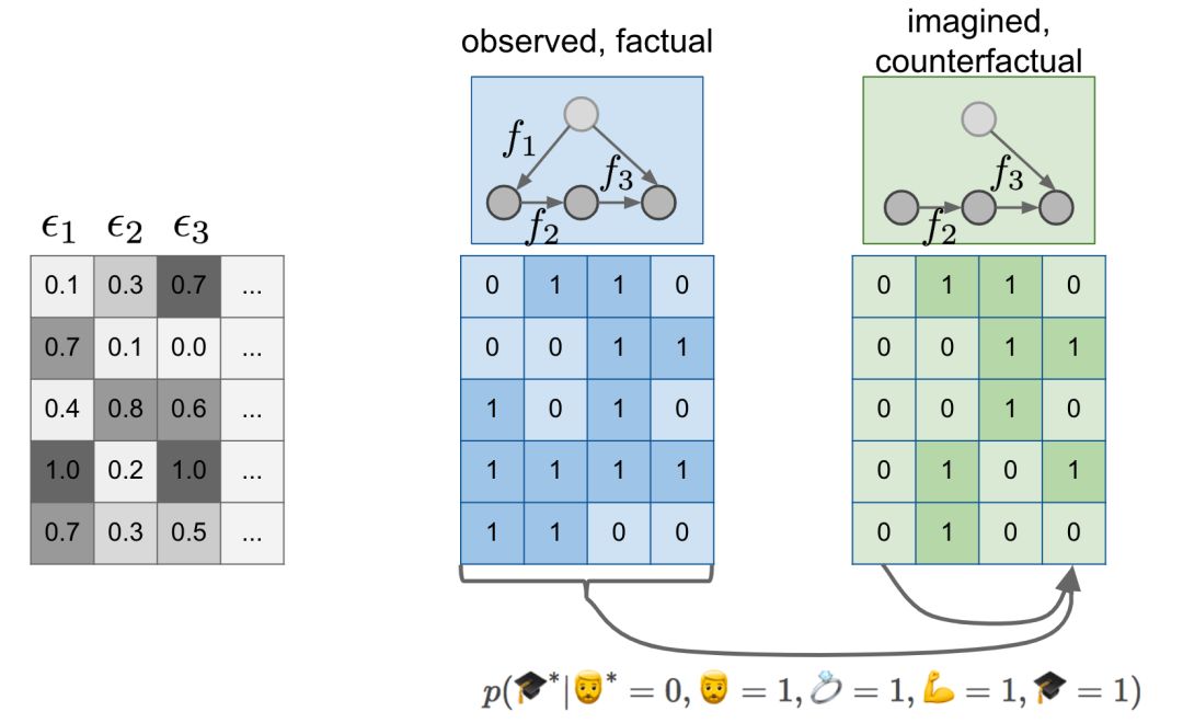 在数学上,反事实就是下面的条件概率:p(🎓∗|🧔∗=0,🧔=1,💍=1,💪=1,🎓=1)