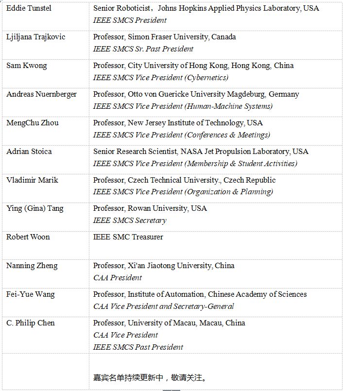请您于5月31日前将参会回执(附件)以电子邮件提交至会务联系人(caa@ia.ac.cn)。IEEE SMC学会重量级嘉宾亲临会场,参会名额有限,欲报从速。