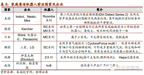 根据中国品牌网统计公布的2013年十大扫地机器人品牌排行榜,我国国产扫地机器人有6家上榜。目前为止,我国已经有一部分表现优良的企业涉足家用清洁机器人的开发和生产,都和国内高校研发机构有所合作,做到研产结合。当前机器人行业发展的宏观前景良好,市场潜力巨大,目前我国会在未来出现一批在细分行业技术领先表现良好的潜力企业。