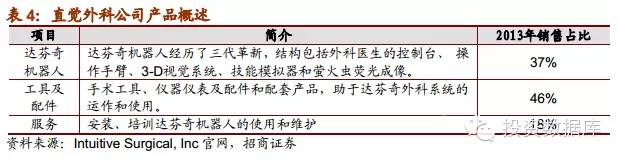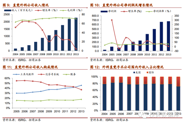 直觉外科公司是全球领先的微创机器人辅助手术机器人公司,2013年营收达22.65亿美元,截止2014年第一季度达芬奇机器人累计销售数量为3039台,2014年8月总市值达159.60亿美元。