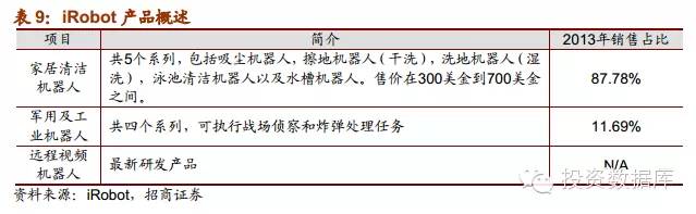 iRobot是家居清洁机器人的领先企业,产品战略布局以家居清洁机器人为主。2014年上半年实现营收2.54亿美元,2013年收入达4.87亿美元,全球市场占有率超过60%,2014年8月总市值为10.10亿美元。