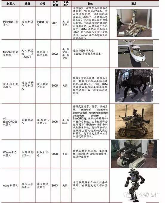 (五)军事机器人是21世纪各国军事安全重点战略:蒂尔集团称未来10年全球无人机研发投入和采购需求将达到940亿美元。军用机器人强国包括美德英法意以日韩,这些国家不仅在技术处于研究的先列,其产品已经在军事上有了实际运用;我国与这些强国的技术差距明显,受政策支持,军事机器人相关企业发展前景明显良好,可能成为企业未来强劲的收入保证。