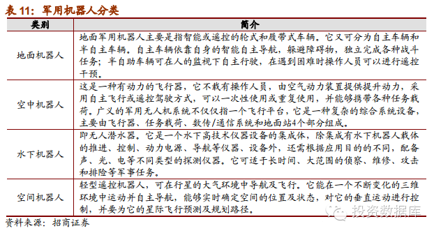 按照使用环境和军事用途来分类,军事机器人大分类:地面军用机器人、空中机器人、水下机器人和空间机器人。