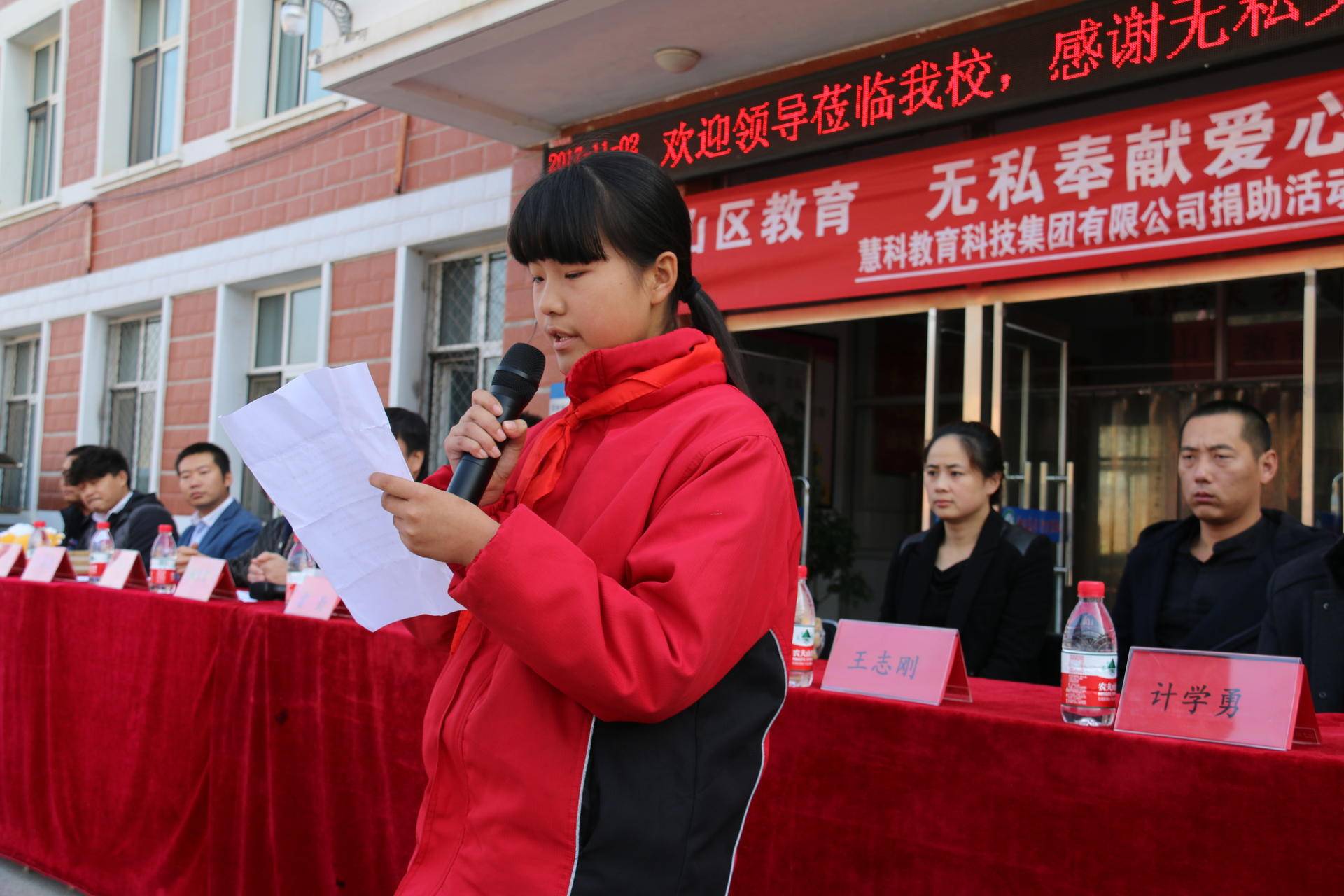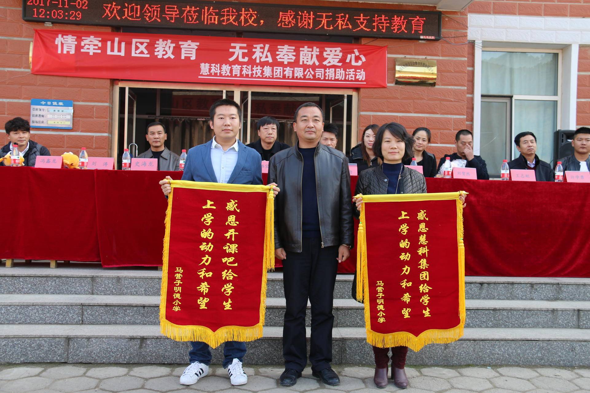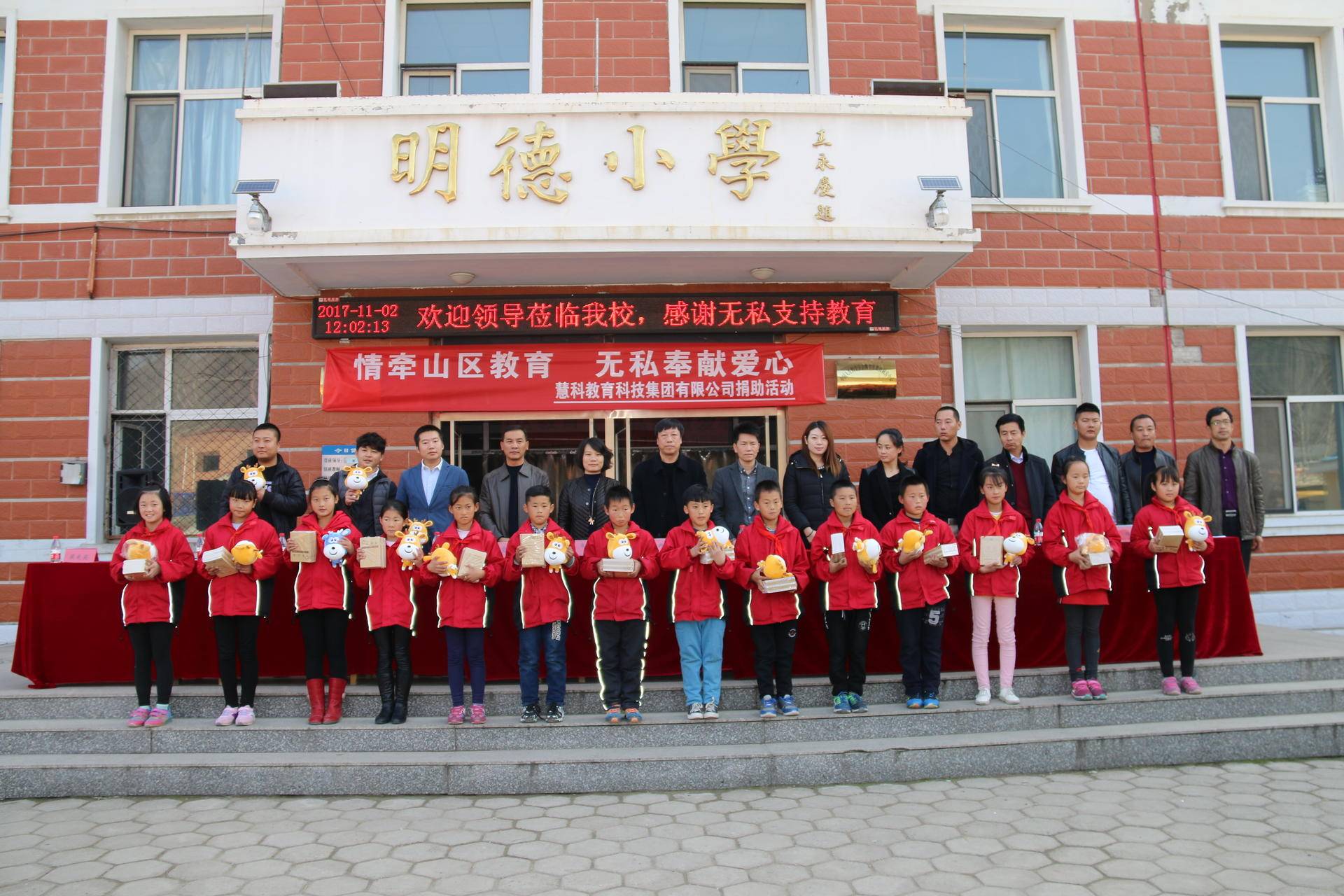 经过三个多小时的车程,我们来到了这所深山里的小学,为了表达感谢,校长精心准备了捐赠仪式,简单却隆重。这次准备的捐赠物资包括400套桌椅(椅子为软座)、体育用品和学习用品。为了让孩子们早点坐上舒适的座椅,开课吧的小伙伴们连夜将座椅运送到明德小学,学校已经给孩子们换上了。在捐赠仪式上,我们的代表将文体用品和慧科集团吉祥物慧小科送到学生们的手中,学生代表发表了致谢感言,最后校方还为我们颁发了锦旗。