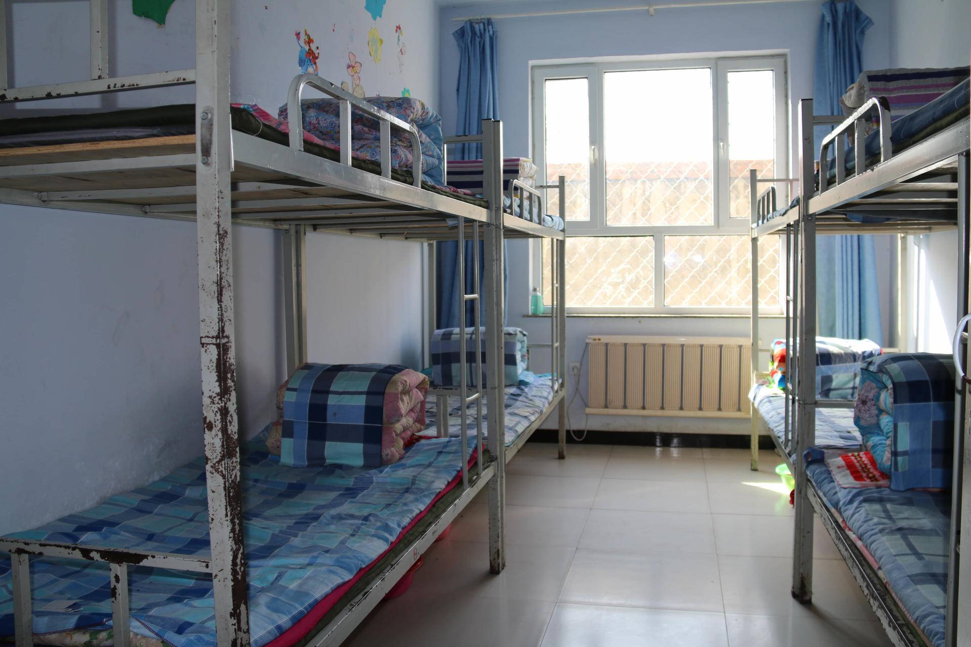孩子们的床铺特写,方方正正的“豆腐块儿”