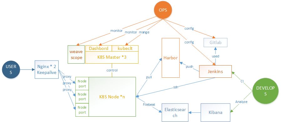 在业务上,Kubernetes默认配置两套Namespace,分别为Master存放正式环境,Develop配置测试环境。