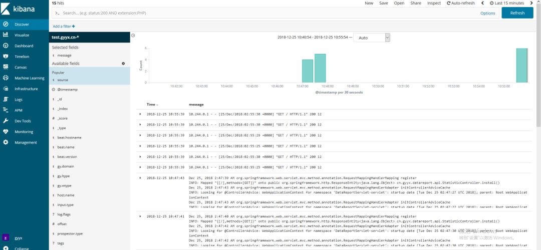 Kibana使用discover查看时,默认展示一个域名下所有的日志,可以通过gy.wtype筛选选择查看测试环境还是正式环境,或者通过gy.ltype哪种日志类型。