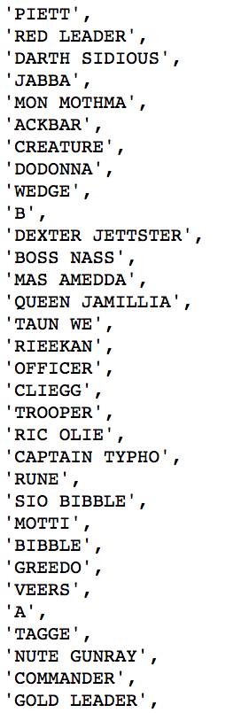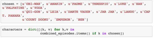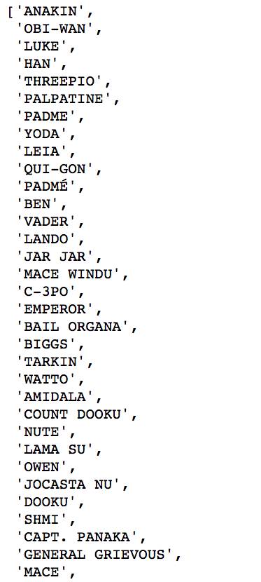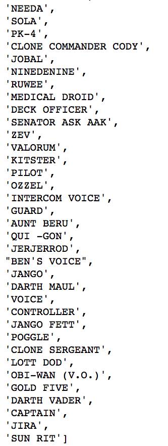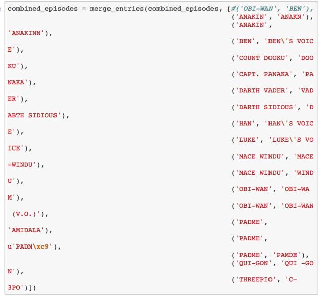 细心的读者可能会发现,实际上属于同一角色的台词条目,却被划分给了“多个”角色,比如,“BEN” 和 “BEN'S VOICE”,以及 “PADM\xc9” 和 “PADME”。因此,接下来,我定义了一个函数,将这些台词条目合并给同一个角色。并且我决定将系列一至系列三中的 OBI-WAN,和系列四至系列六中的 BEN 当成两个独立的角色。