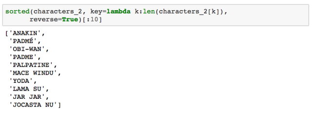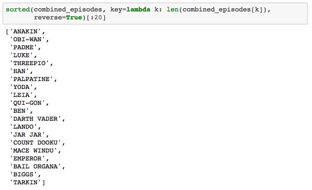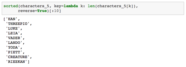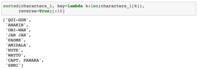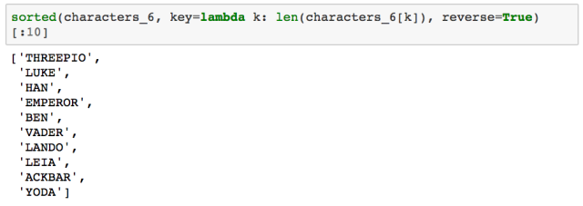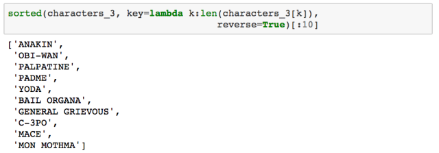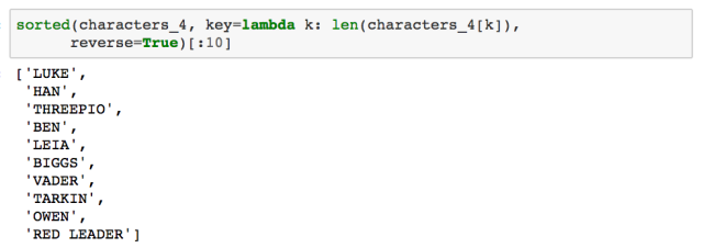 爬取出来的结果是以字典格式存储的,形如,{角色名称:台词}。这能让我们得到星战四中台词数排名前十的人物角色: