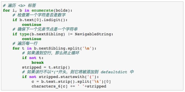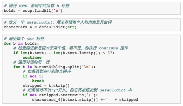 因此,我们可以简单地遍历所有 <b> 标签,检查其中嵌套的文本内容是否始于数字,如果不是始于数字,则表明该内容是角色名称,那么接下来的步骤和前面几部的是一样的。