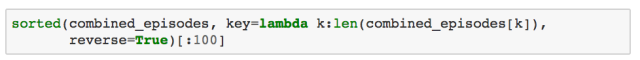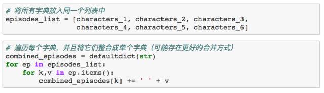 我们已经得到了从每部剧集中提取出来的对话内容,接下来,我们会将这些对话内容整合到单个字典中。老实说,我们可以从一开始就使用单个字典来存储这些剧集中的对话内容。我没有这样做的原因在于,考虑到有人可能想要分析这些剧集之间的关系。