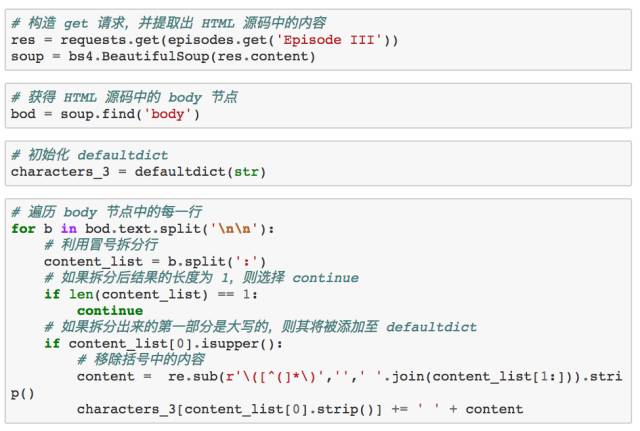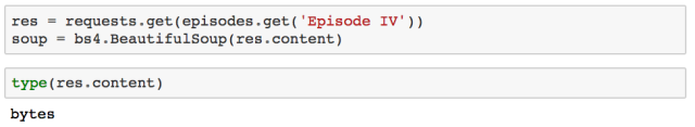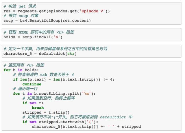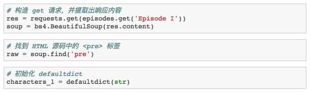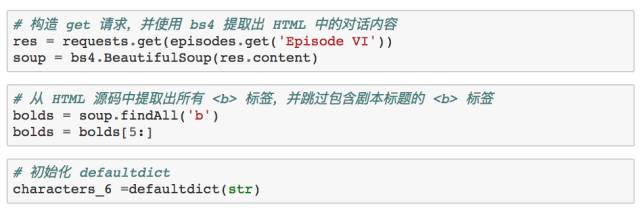 我会按照电影上映的日期来进行爬取,因此我首先爬取星战系列中的第四部。我们只需要简单地构造一个包含目标链接的 GET 请求,就可以得到电影剧本了。得到的响应内容则会被转换为一个 BeautifulSoup 对象。