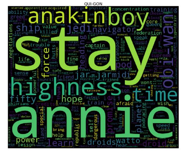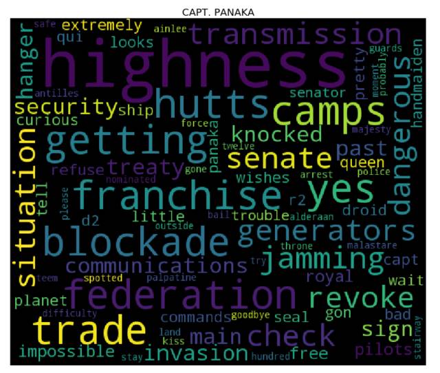是时候生成词云了! 为了达到目的,对于 cleaned 字典中的每个角色而言,我们需要先计算其对应的每个单词的词频(使用 collections库中的 Counter),然后将结果输入到 wordcloud 库中(这就和用单词、频率列表来实例化 WordCloud 类一样简单 —— 事实上,你还可以使用纯文本)。我们接下来会使用 matplotlib 库来展现词云。