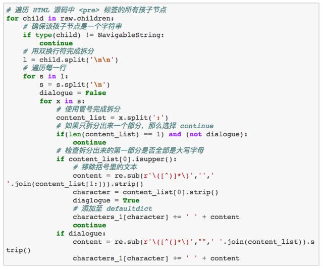 已经到了最后一部啦!在查看 HTML 源码后,对话文本的提取在这里开始变得相当简单:我们简单地遍历 <body> 标签下的每一行(使用双换行符 \n\n 来拆分文本)—— 如果该行包含一个冒号,并且拆分出来的第一部分是大写的,则当前行即为对话文本...以上便是我们所需要完成的步骤。