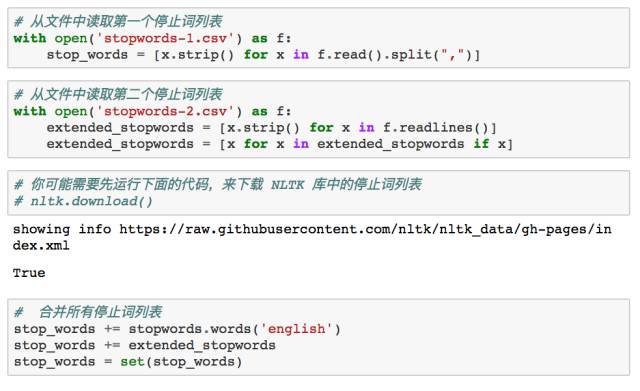 下一步我们需要做的是,移除提取出来的文本中的停止词。为了达到目的,我使用三个不同的停止词词源:其中两个是我用谷歌搜索到的英文停止词词源,剩下的那个是 Python 的 NLTK 库(http://www.nltk.org/)自带的停止词词库。
