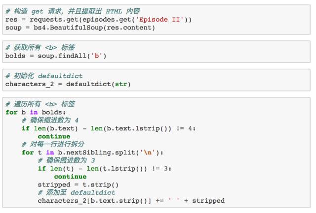 在快速查看 HTML 源码后,我发现,嵌入了人物名称(比如 THREEPIO)的 <b> 标签下紧跟着的便是对应人物的台词内容。然而,我发现,人物对话发生的位置场景描述(比如,INT. REBEL BLOCKADE RUNNER)也以同样的结构被放在了 HTML 源码中。两者的区别在于,包含人物名称的 <b> 标签缩进得更多(实际上确切来说,缩进了 37 个空格)。因此,我采用的爬取方式是遍历 soup 中的所有 <b> 标签,并且检查该 <b> 标签是否至少缩进了 37 个空格(否则该 <b> 标签下的文本内容应该是位置场景描述),若是的话,我们便只需要提取出该 <b> 标签的闭合标签后紧跟的文本内容,就能得到人物台词了。