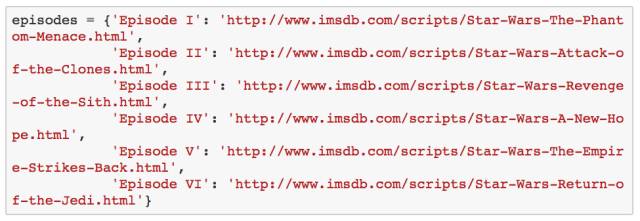 正如前文中提到的,我会把 IMDSb (http://www.imsdb.com/ )作为我们的数据源。下面我将建立一个字典,用来存储星战系列电影名称及其对应的数据库链接。