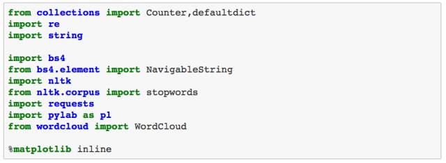 首先,我们需要导入一些后文中一定会用到的库。正如前文所说,为了爬取包含电影剧本的 HTML 页面,我会结合使用 requests 和 BeautifulSoup,requests 用来发起 HTTP 请求,而 BeautifulSoup 用来解析 HTML 页面,并提取出我们想要的内容。另外,我们还需要导入一些辅助性的库(比如 collections),用来处理字符的库(re、string 和 nltk),用来画图的 matplotlib 库,以及用来生成词云的 wordcloud 库。