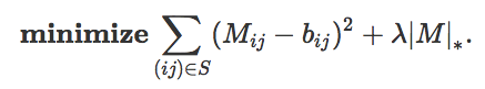 基于核/迹范数最小化的著名算法如下:找到适合所有已知观察并具有最小核范数的矩阵(注意,核范数是秩的凸松弛)。也可以将此作为常规视角所要求的形式的单个目标改写如下,其中 S 是已知条目的索引的子集,λ是乘数: